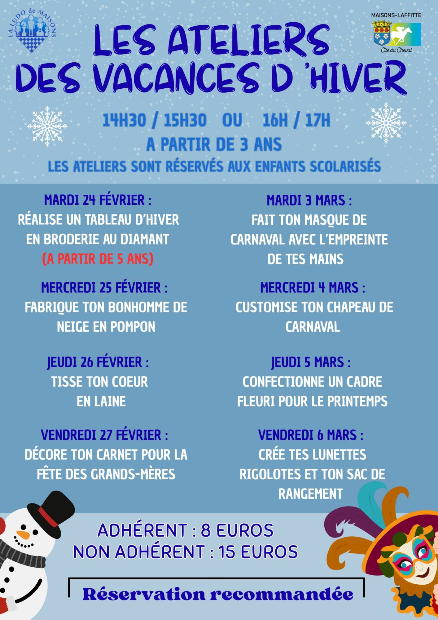- Mercredi 25 février : Fabrique ton bonhomme de neige en pompon Reste 5 places à 14h30/ Reste 5 places à 16h